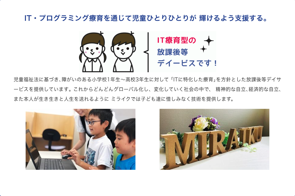 パソコン教室のレベルではなく、プロで活躍できるスキルを学び、 経済的な自立、精神的な自立を目指し、IT技術習得の支援をします。 最初はパソコン、タブレットPCに慣れることからスタートし、ビジュアルプログラミング、ロボットの制作+プログラミングまで、一人ひとりに合ったプログラムを提供いたします。