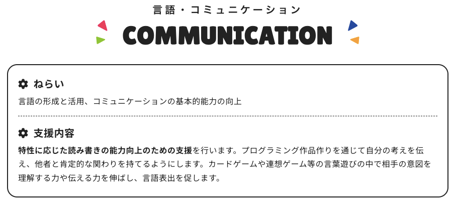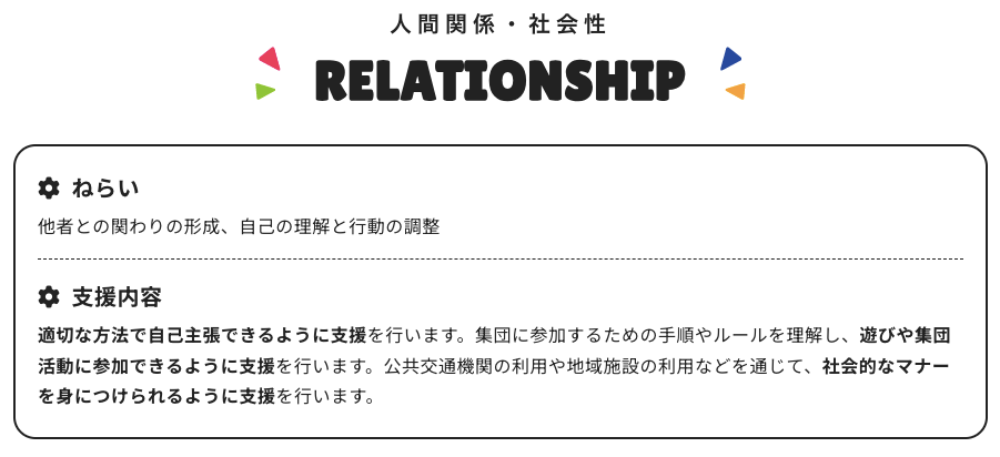 児童発達支援ガイドライン及び放課後等デイサービスガイドラインにある「①健康・生活」「②運動・感覚」「③認知・行動」「④言語・コミュニケーション」「⑤人間関係・社会性」の5領域をすべて考慮し支援プログラムを考えております。本人が生き生きと人生が送れるように支援を行います。